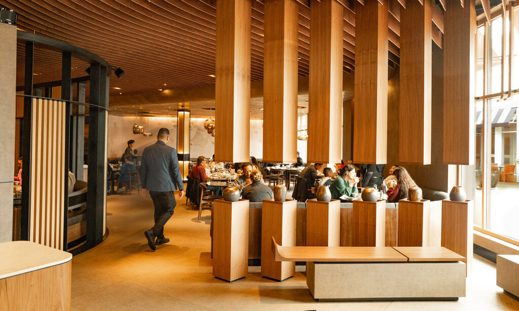 An army of chefs crafts the intricate dumplings in a showcase kitchen visible to shoppers passing by. Just inside the entry is the golden dumpling mascot, Bao Bao. Beyond are elegant dining areas, dumpling-inspired, “pleated” ceilings and a spectacular pine tree centerpiece.